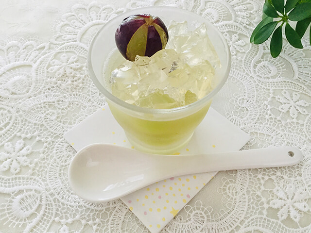 このレシピでは、ハチミツとレモン汁で味付けしたハチミツレモンゼリーに種無し巨峰を入れました。