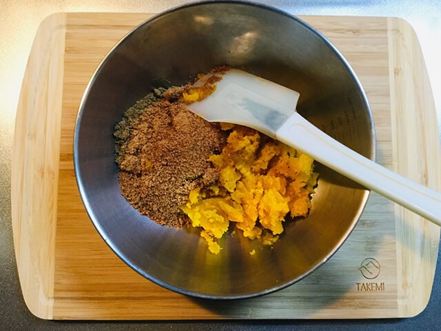 1.かぼちゃを適当な大きさに切って蒸すか茹でて、柔らかくなったら黄色い部分を取り出し、ココナッツシュガー、シナモンを加え、ブレンダー等で混ぜます。
