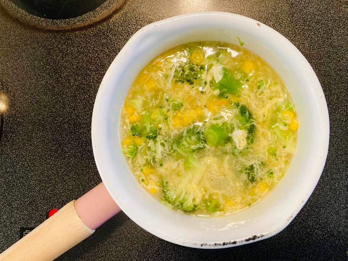 1. 鍋に水を沸騰させ、ブロッコリー、スープの素、コーンを入れて数分茹でます。