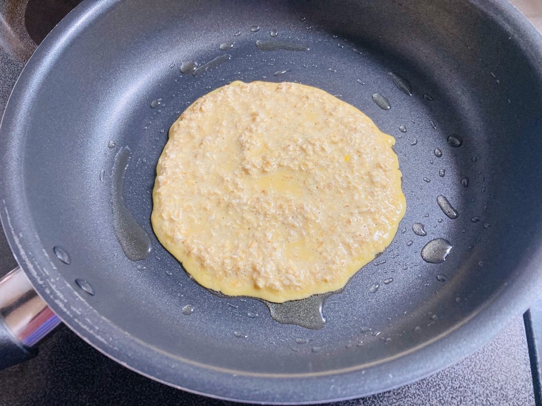 1. フライパンに米油などを敷いて中火で熱し、生地を流し入れて3分ほど焼いて完成です。